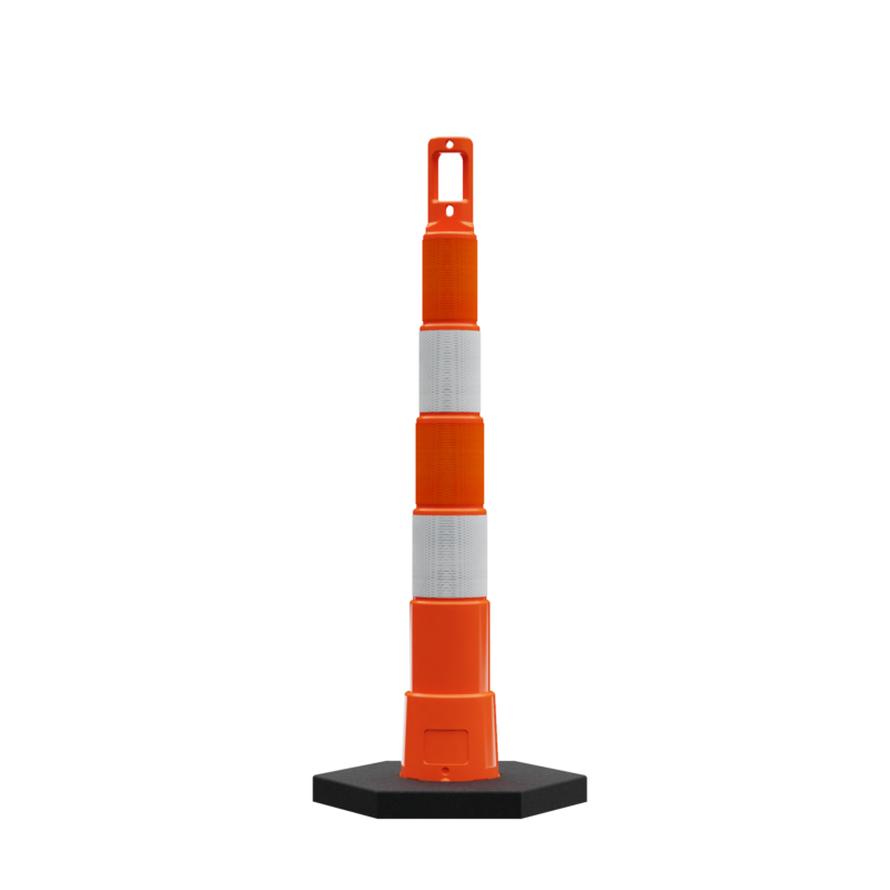Designed to withstand repeated impacts with little or no damage to vehicles or unit and stackable with or without base. 42″ tall with 4 bands for 4″ high intensity sheeting, per TMUTCD specifications. 30 lb bases available. Available in orange, with or without high intensity sheeting.