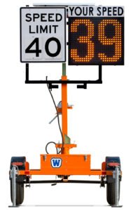 The Vertical Mast Radar-Speed Trailer features a telescoping tower that rises to 11 feet with side-by-side speed display and speed limit sign on a sturdy frame. Both the electronic LED speed display and the regulatory speed limit sign are visible over Jersey barriers and other obstructions. The display shows vehicle speed in bold 26-inch characters, warning motorists to slow down by flashing their excessive speed. The sign has changeable speed limit numbers. The tower is easily raised and lowered using a hand-operated winch. When raised, the tower rotates to face traffic without moving the trailer. When lowered for transport, dual cradles support the sign frame.