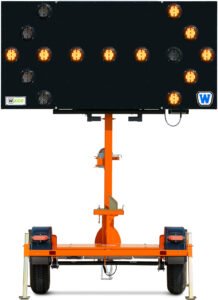 W|ECO Vertical-Mast Arrow Boards feature a display panel that remains vertical at all times and rotates to face traffic. They are highly reliable, visible from distances of a mile or more, and employ a unique high-efficiency power system. The display is raised and lowered on a vertical tower using a hand-operated winch. Both 15-light and 25-light models are available. Connected arrow boards can be accessed remotely using Wanco Fleet Manager.