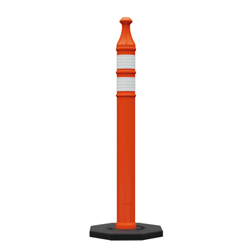 42″ delineator with overall height of 47.25″ with grip knob. The 4″ wide tube has recessed sheeting areas to protect two bands of sheeting. Rubber bases available. Perfect for cone bars!
