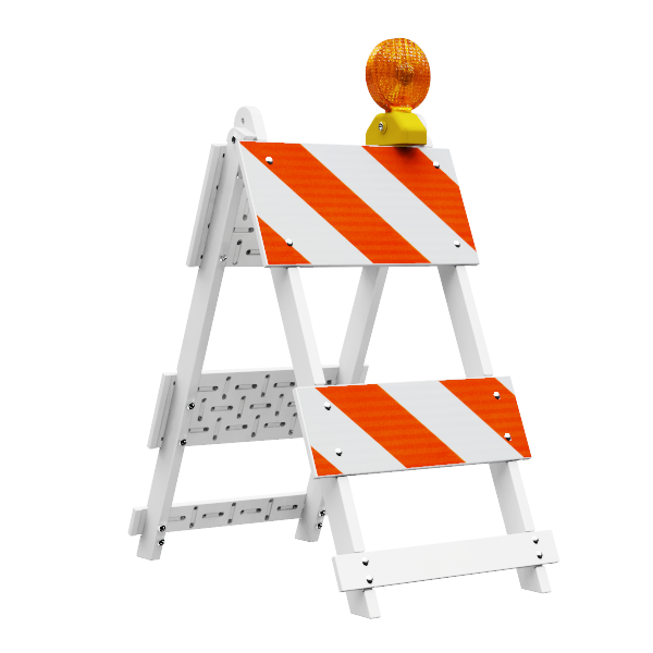 A Type II barricade designed for strength & rigidity. It’s built from component parts assuring easy replacement when damage occurs. All plastic ensures no rusting, with little maintenance required. Features 2 light receptacles.